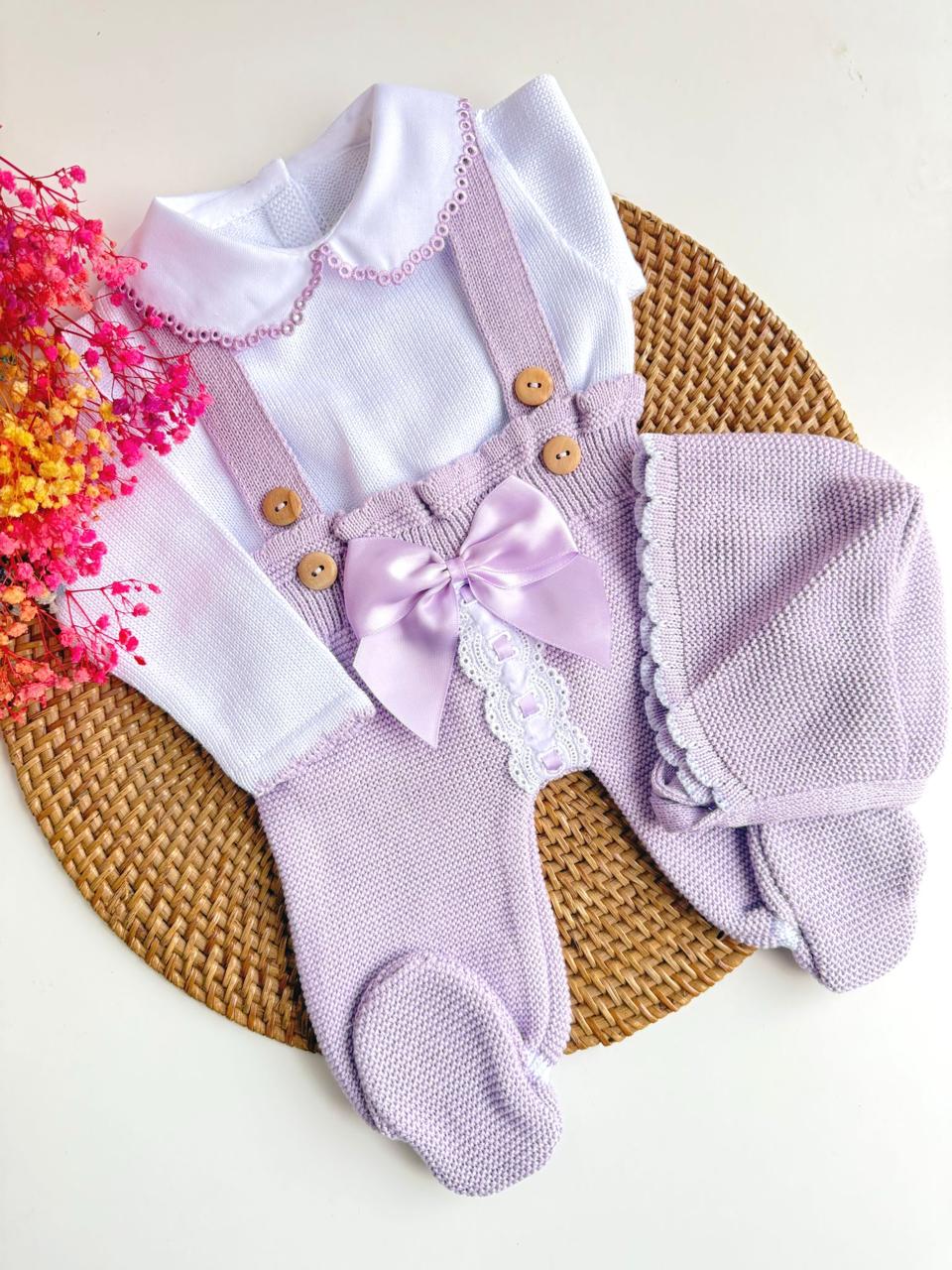 Traje de primera puesta para vestir al bebé en sus primeras semanas de vida. El conjunto es un tres piezas de jersey, overol y capota. Elaborado en algodón 100 %.