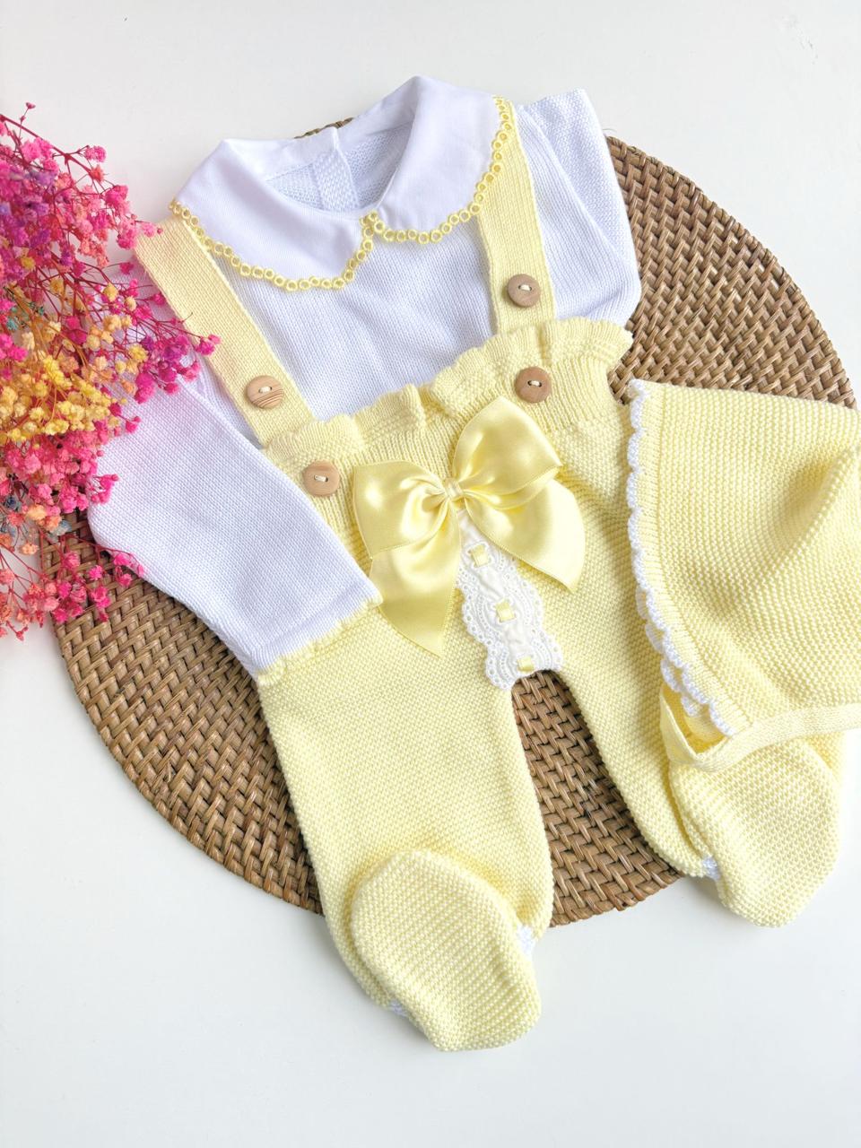 Traje de primera puesta para vestir al bebé en sus primeras semanas de vida. El conjunto es un tres piezas de jersey, overol y capota. Elaborado en algodón 100 %.