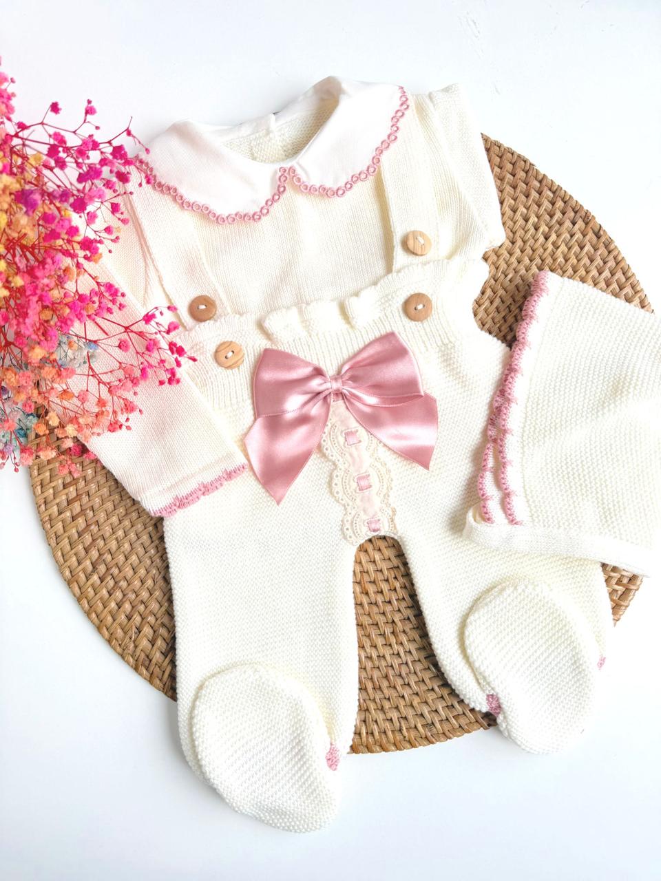 Traje de primera puesta para vestir al bebé en sus primeras semanas de vida. El conjunto es un tres piezas de jersey, overol y capota. Elaborado en algodón 100 %.