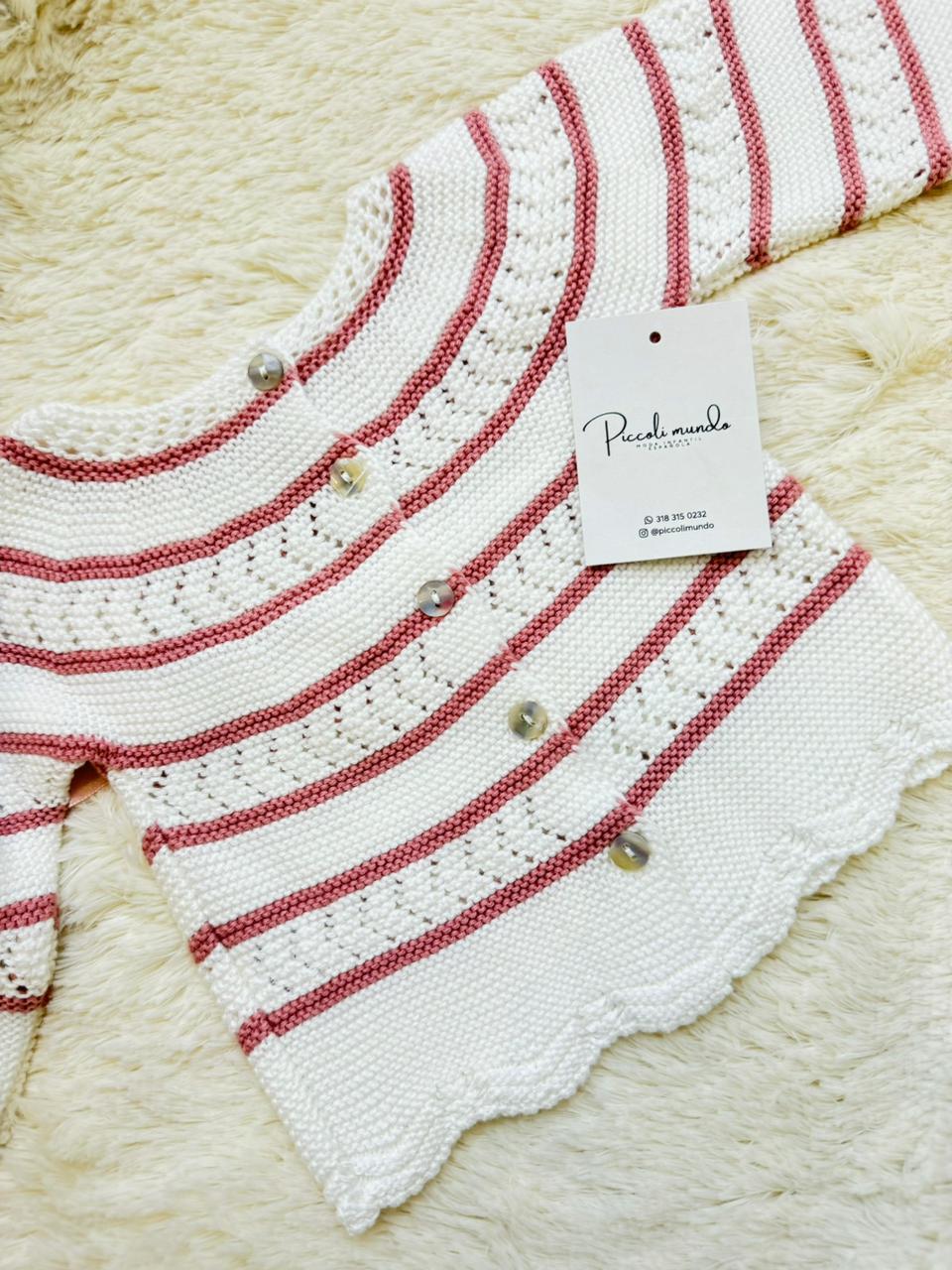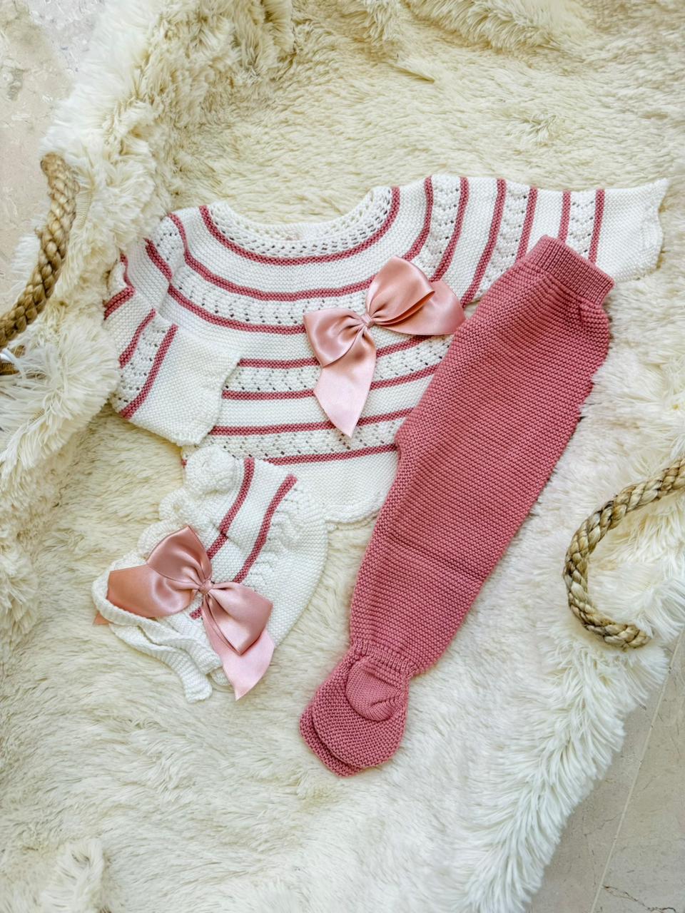 Traje de primera puesta para vestir al bebé en sus primeras semanas de vida. El conjunto es un tres piezas de jersey, polaina y capota. Elaborado en algodón 100 %.