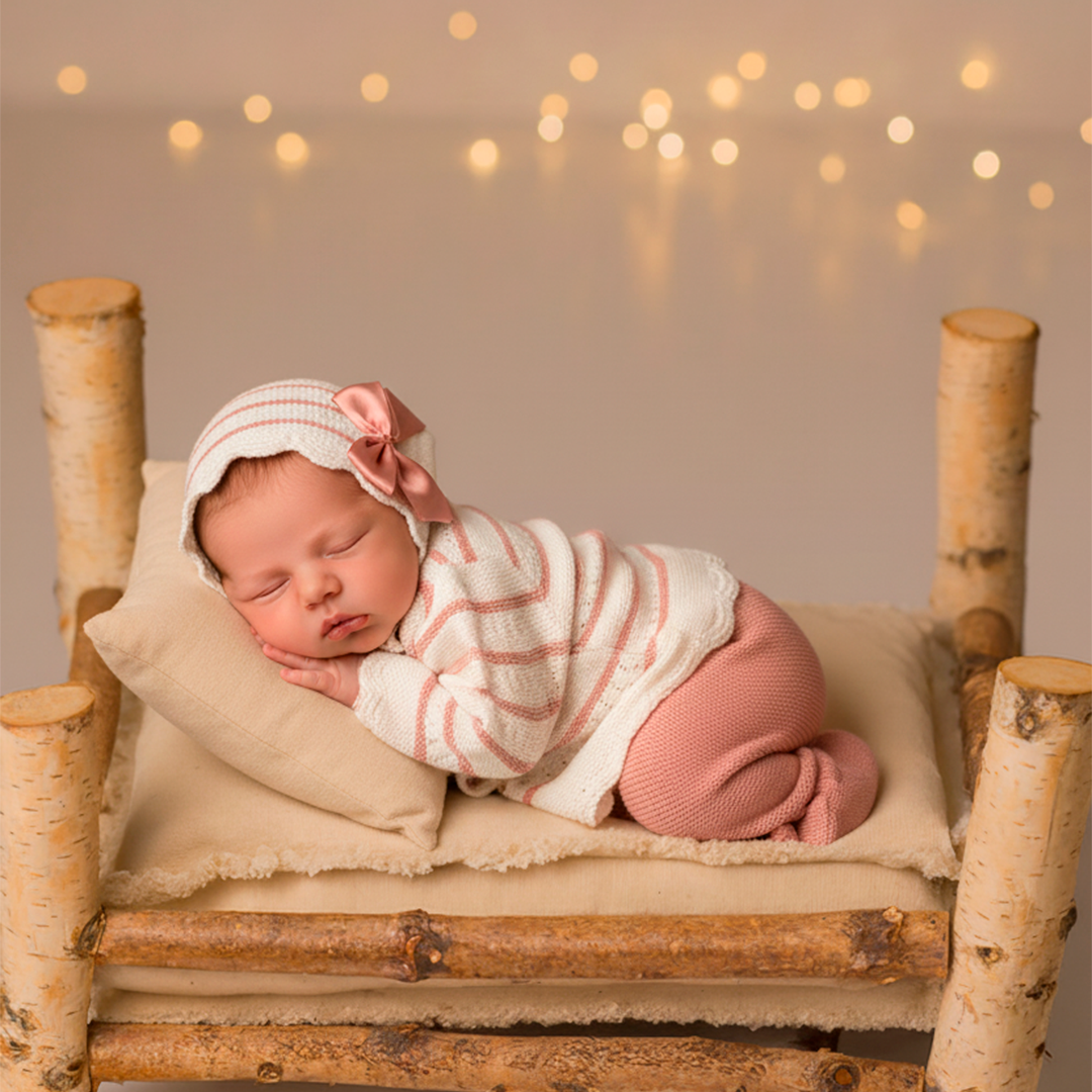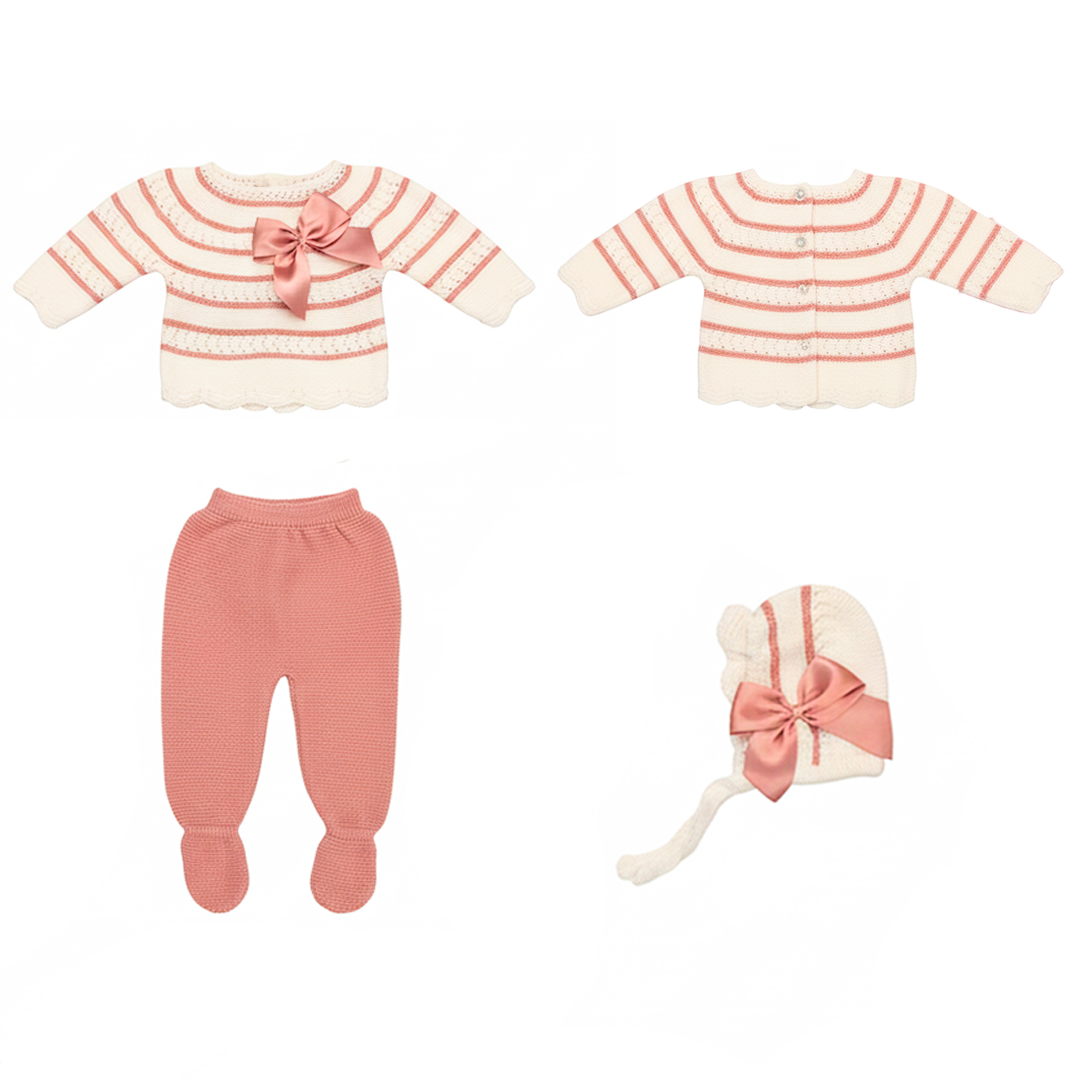 Traje de primera puesta para vestir al bebé en sus primeras semanas de vida. El conjunto es de tres piezas de jersey, polaina y capota.