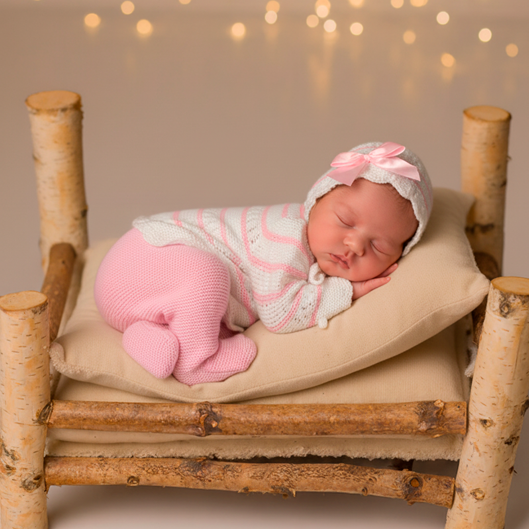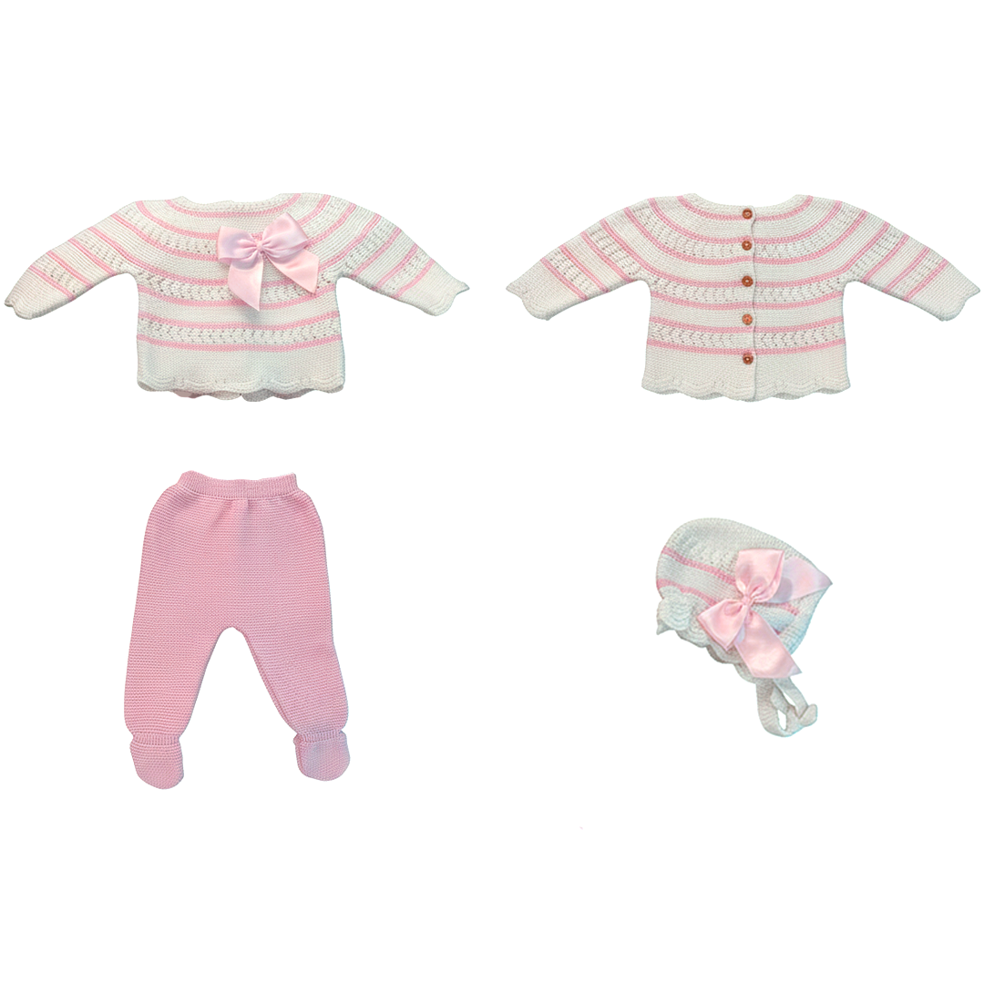 Traje de primera puesta para vestir al bebé en sus primeras semanas de vida. El conjunto es de tres piezas de jersey, polaina y capota.