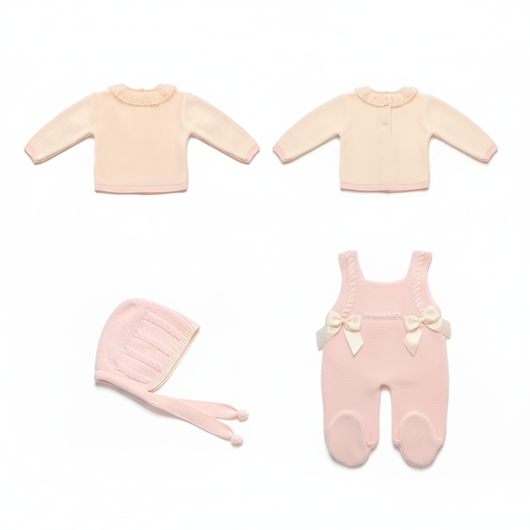 Traje de primera puesta para vestir al bebé en sus primeras semanas de vida. El conjunto es de tres piezas de jersey, polaina y capota.