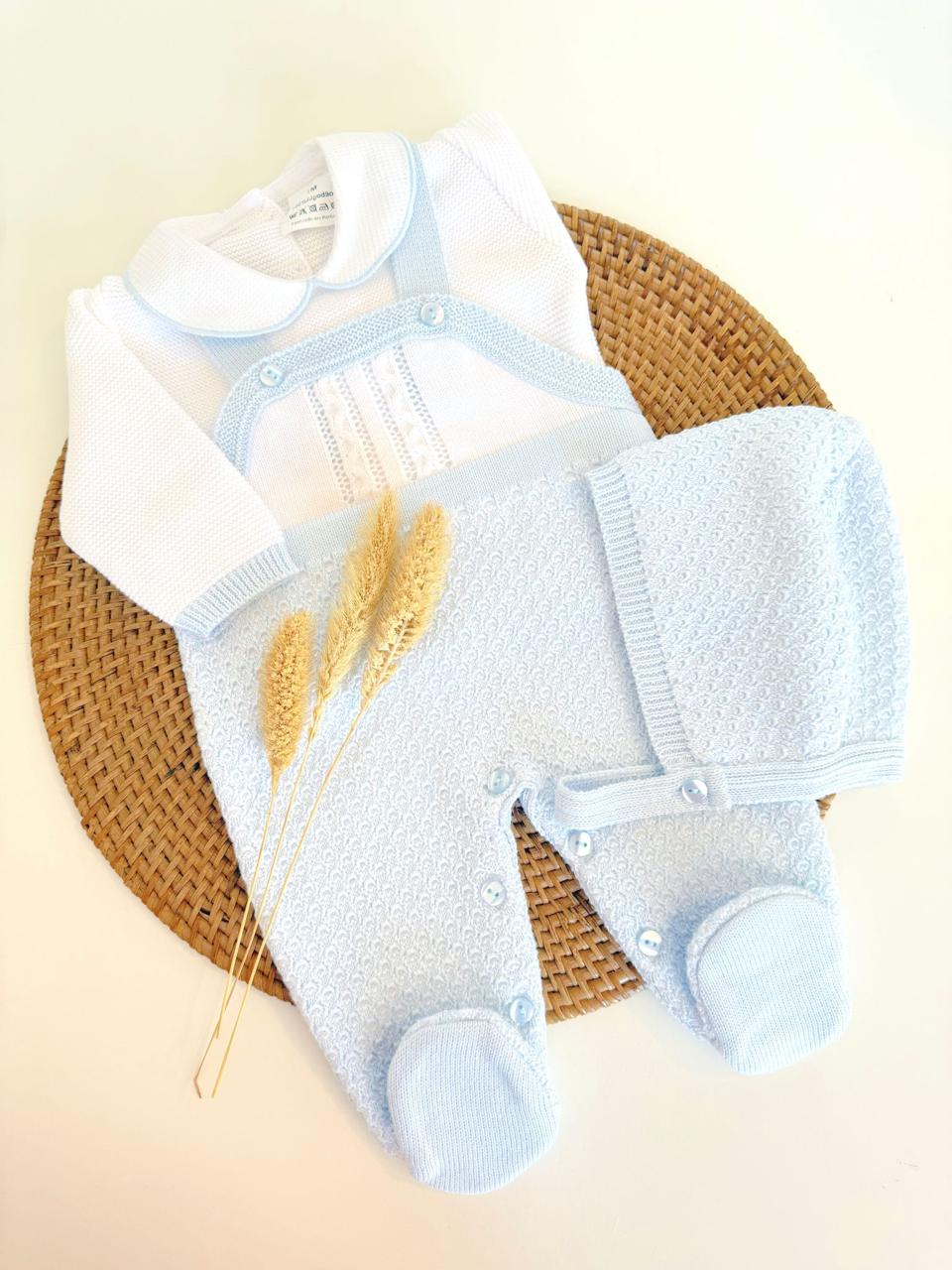 Traje de primera puesta para vestir al bebé en sus primeras semanas de vida. El conjunto es un tres piezas de jersey, Overol y capota.