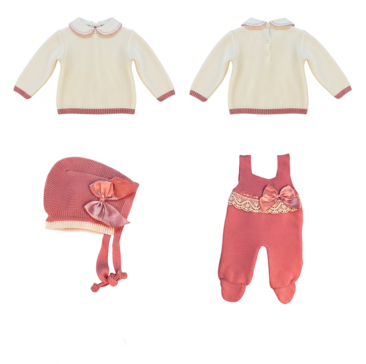 Traje de primera puesta para vestir al bebé en sus primeras semanas de vida. El conjunto es de tres piezas de jersey, polaina y capota. Elaborado en algodón 100 % hipoalergénico.