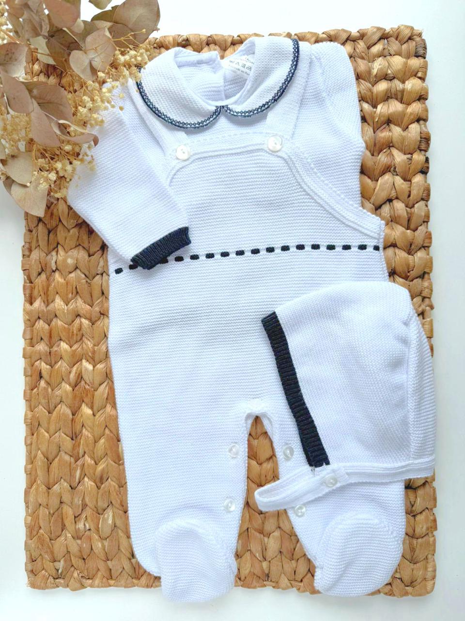 Traje de primera puesta para vestir al bebé en sus primeras semanas de vida. El conjunto es un tres piezas de jersey, Overol y capota. Elaborado en algodón 100 %.