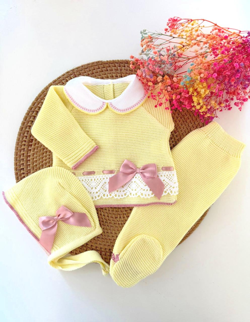 Traje de primera puesta para vestir al bebé en sus primeras semanas de vida. El conjunto es un tres piezas de jersey, pantalón y capota. Elaborado en algodón 100 %.
