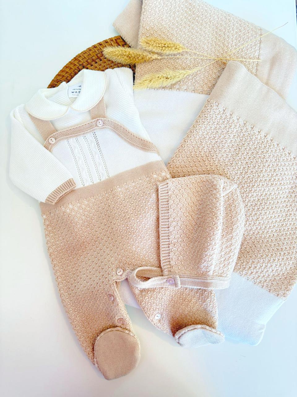 Traje de primera puesta para vestir al bebé en sus primeras semanas de vida. El conjunto es un tres piezas de jersey, Overol y capota.